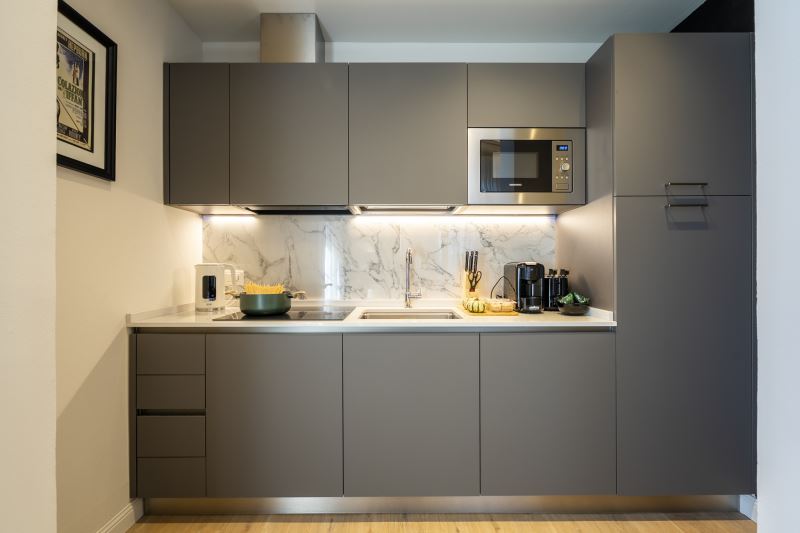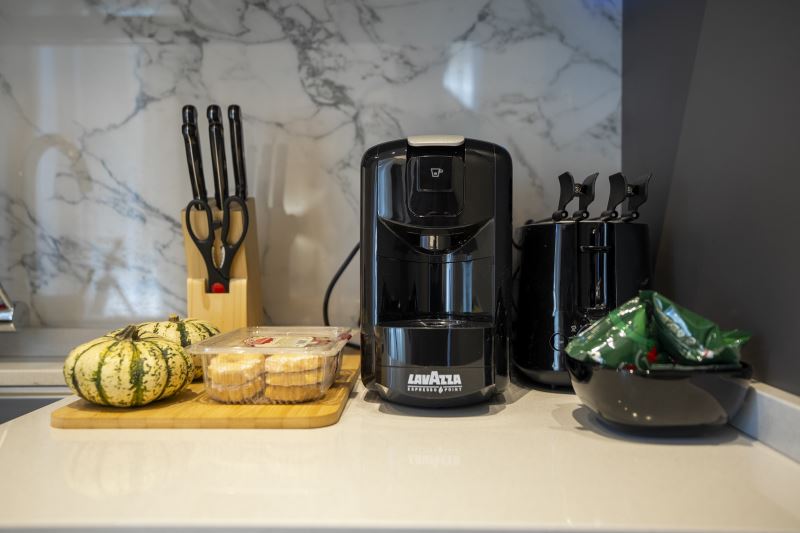 La cucina è moderna con piano cottura ad induzione, dotata di tutti gli utensili e le posate, forno, microonde, frigo, freezer, macchina per il caffè espresso, bollitore e tostapane