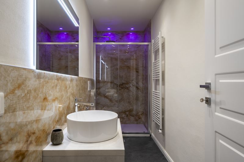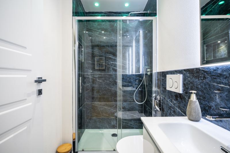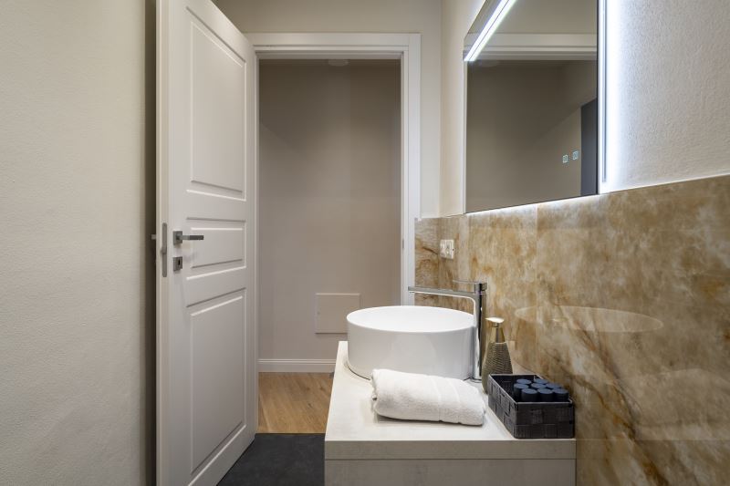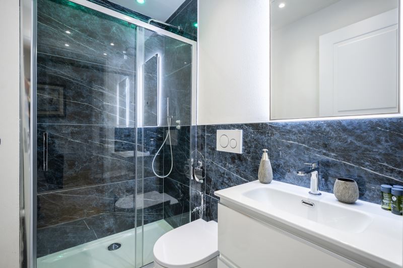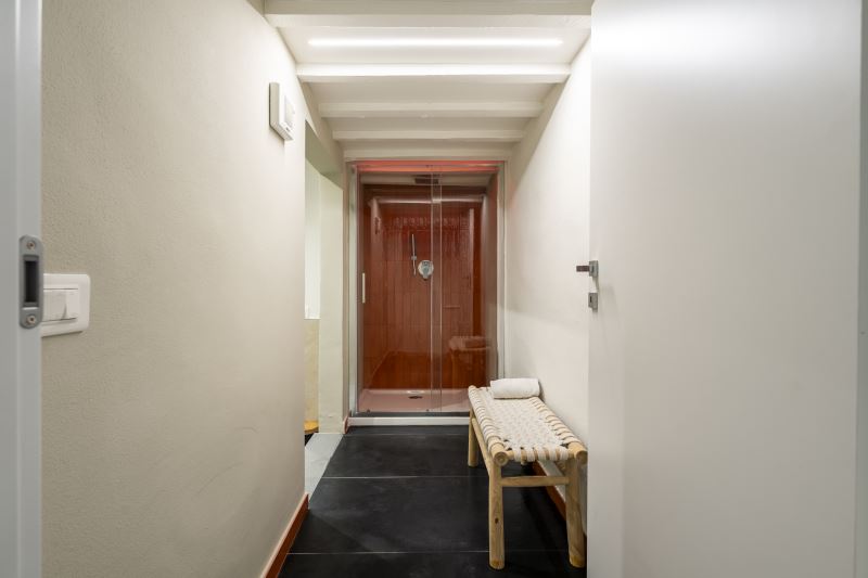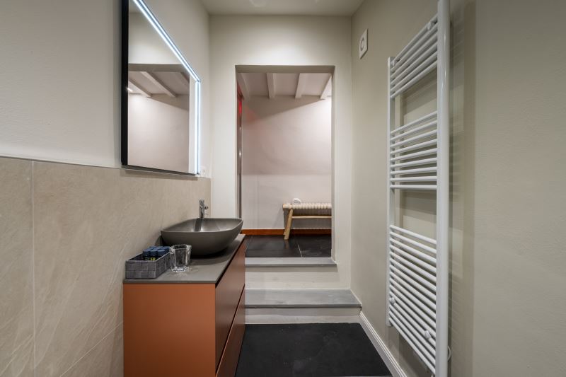 I bagni sono tutti e 3 posizionati vicino alle camere da letto e tutti sono dotati di box doccia con la funzione cromo terapia, sanitari e Kit di cortesia composto da Shampoo e Bagno-schiuma