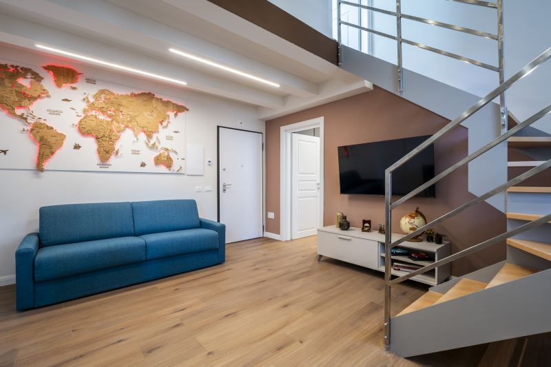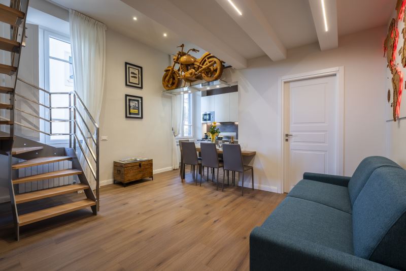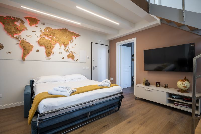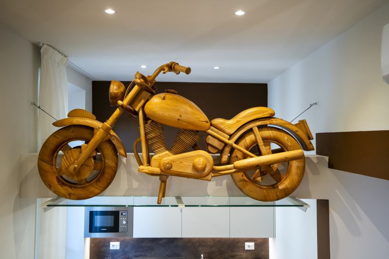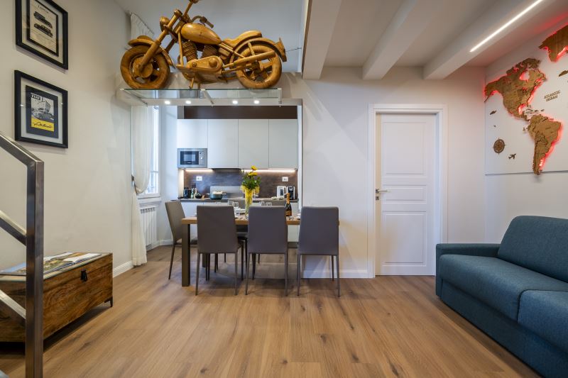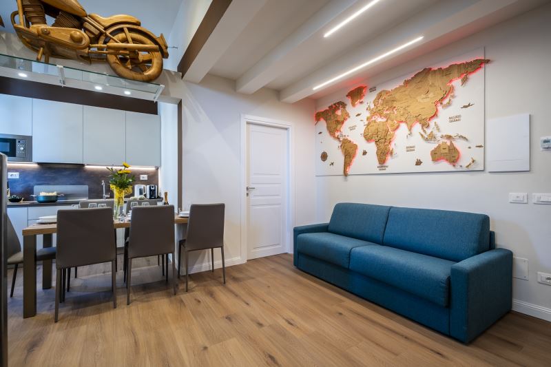 Le stanze sono caratterizzate da stile e arredamento che richiamano al Viaggio con vari oggetti di design disposti all'interno dell’appartamento, tra cui una moto artigianale in legno a dimensioni reali e una mappa di legno illuminata.