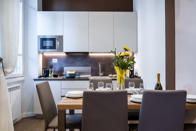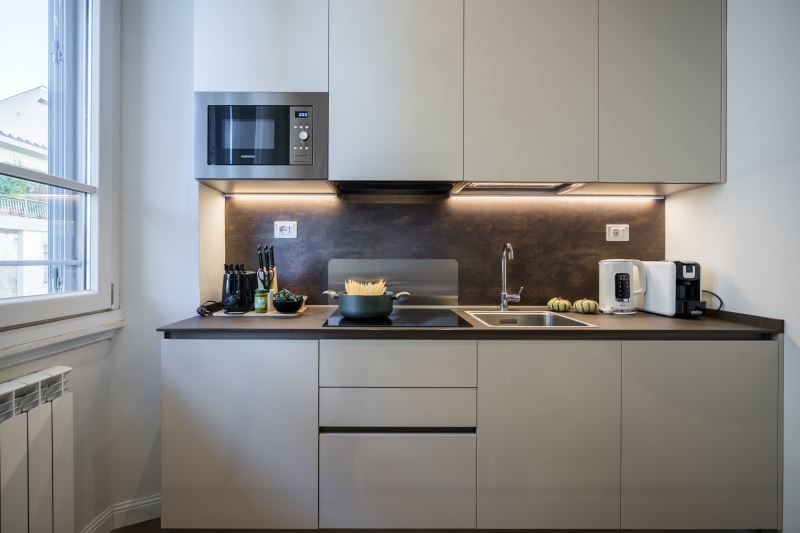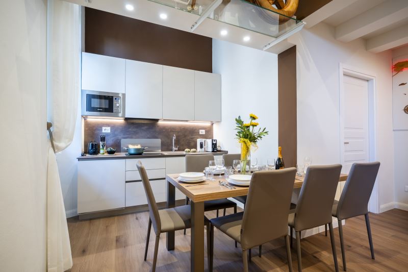 La cucina è moderna con piano cottura ad induzione, dotata di tutti gli utensili e le posate, forno, microonde, frigo, freezer, macchina per il caffè espresso, bollitore e tostapane
