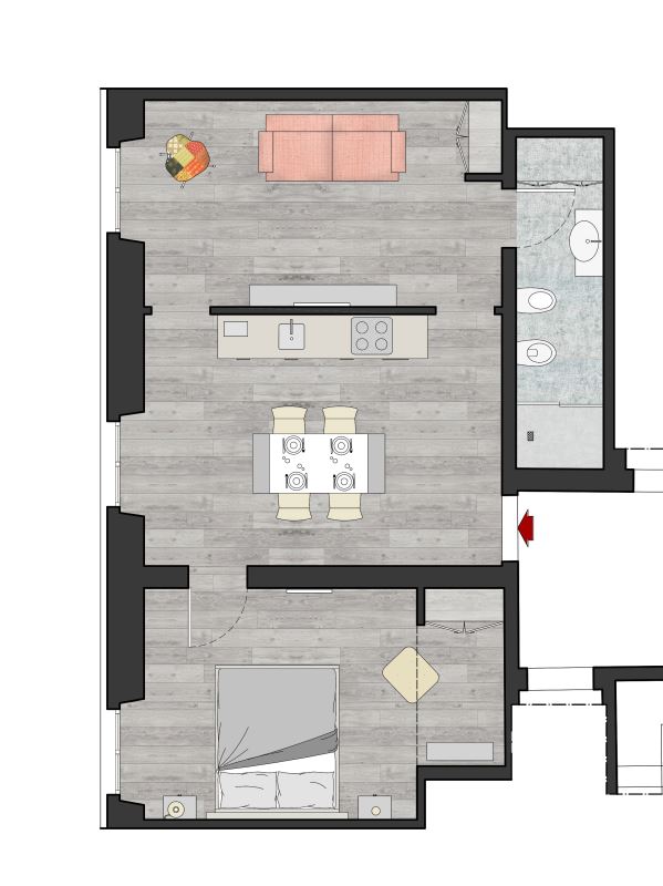 L’appartamento Game è composto da una camera matrimoniale, da un soggiorno con divano letto e una tv di 50 ‘’a schermo piatto, una cucina ben attrezzata, e da un bagno con doccia a soffione e cromoterapia. L’appartamento è dotato di Wi-Fi veloce, tv schermo piatto in ogni stanza, aria condizionata ed è completamente insonorizzato.